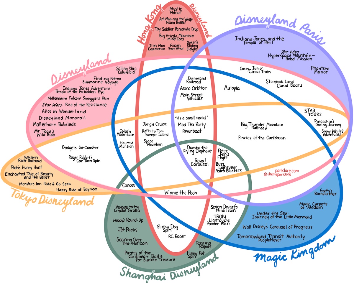 Park Lore On Twitter After Many Many Drafts Resizings And Restartings It S Done My Six Way Venn Diagram Of Every Ride At Every Disneyland Style Park And How Their Ride Lineups Overlap Here S